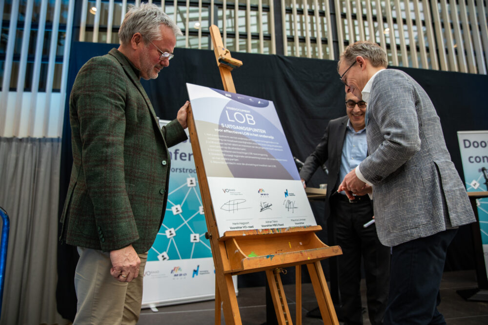 Na deze indrukwekkende persoonlijke verhalen, beklimmen de voorzitters van de VO-raad (Henk Hagoort), de MBO Raad (Adnan Tekin) en de Vereniging Hogescholen (Maurice Limmen) het podium. Zij ondertekenen de gezamenlijke LOB-Visie en bekrachtigen daarmee hun ambitie om loopbaanoriëntatie, -ontwikkeling en -begeleiding stevig te verankeren in de hele onderwijskolom. In de visie staat centraal dat alle jongeren moeten kunnen rekenen op samenhangende en kwalitatief goede begeleiding bij hun talentontwikkeling, het maken van bewuste keuzes en het zetten van vervolgstappen richting vervolgonderwijs en arbeidsmarkt. ‘LOB wordt al maar belangrijker, juist omdat de samenleving ingewikkelder wordt en de arbeidsmarkt steeds sneller verandert’, benadrukken de drie voorzitters. ‘Veel jongeren en hun ouders kunnen het niet meer alleen overzien. Daarom is het zo belangrijk dat we LOB met elkaar goed regelen in het onderwijs. Dat er goede faciliteiten zijn om met jongeren te praten over hun ervaringen, talenten en toekomstkeuzes. Zeker voor wie thuis niemand heeft om dit soort gesprekken mee te voeren.’